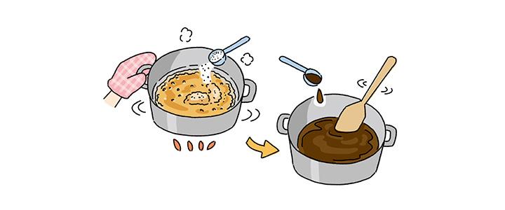 - 鍋を中火にかけ、砂糖を2~3回に分けて入れて、鍋を回しながら溶かす。ほんのりキャラメル色になったら火を止めて、コーヒーを入れ、ヘラなどでしっかり混ぜる。